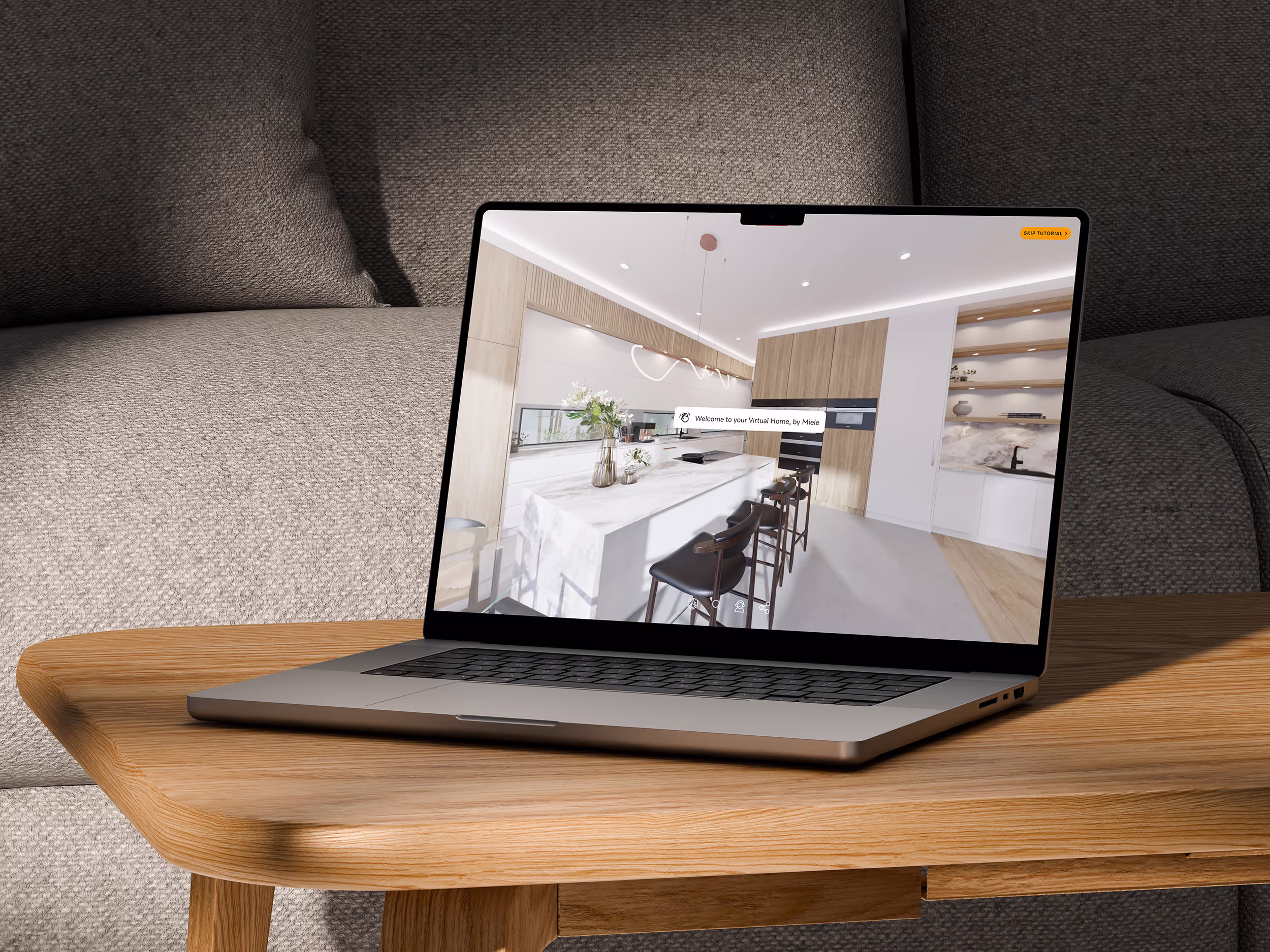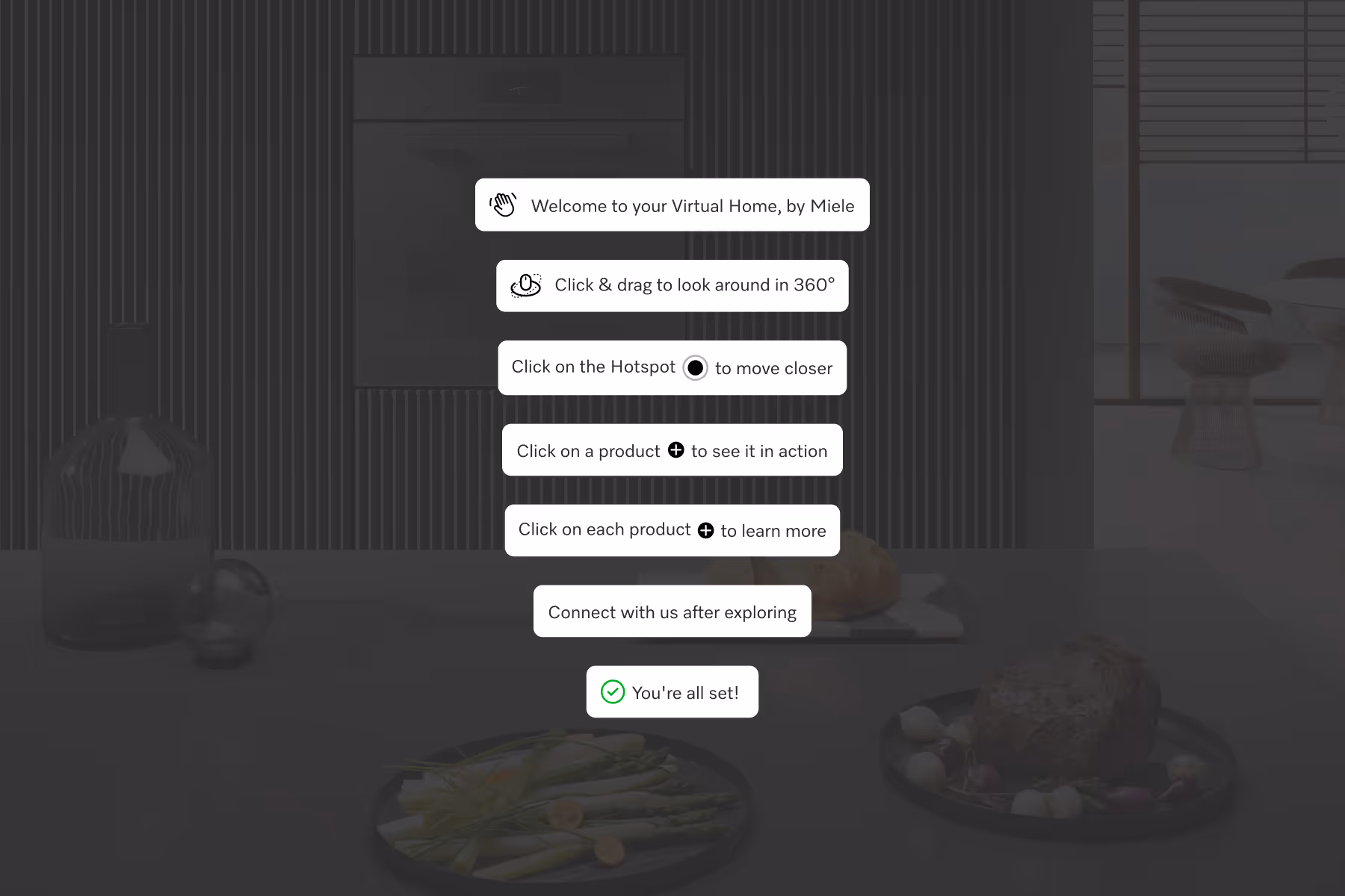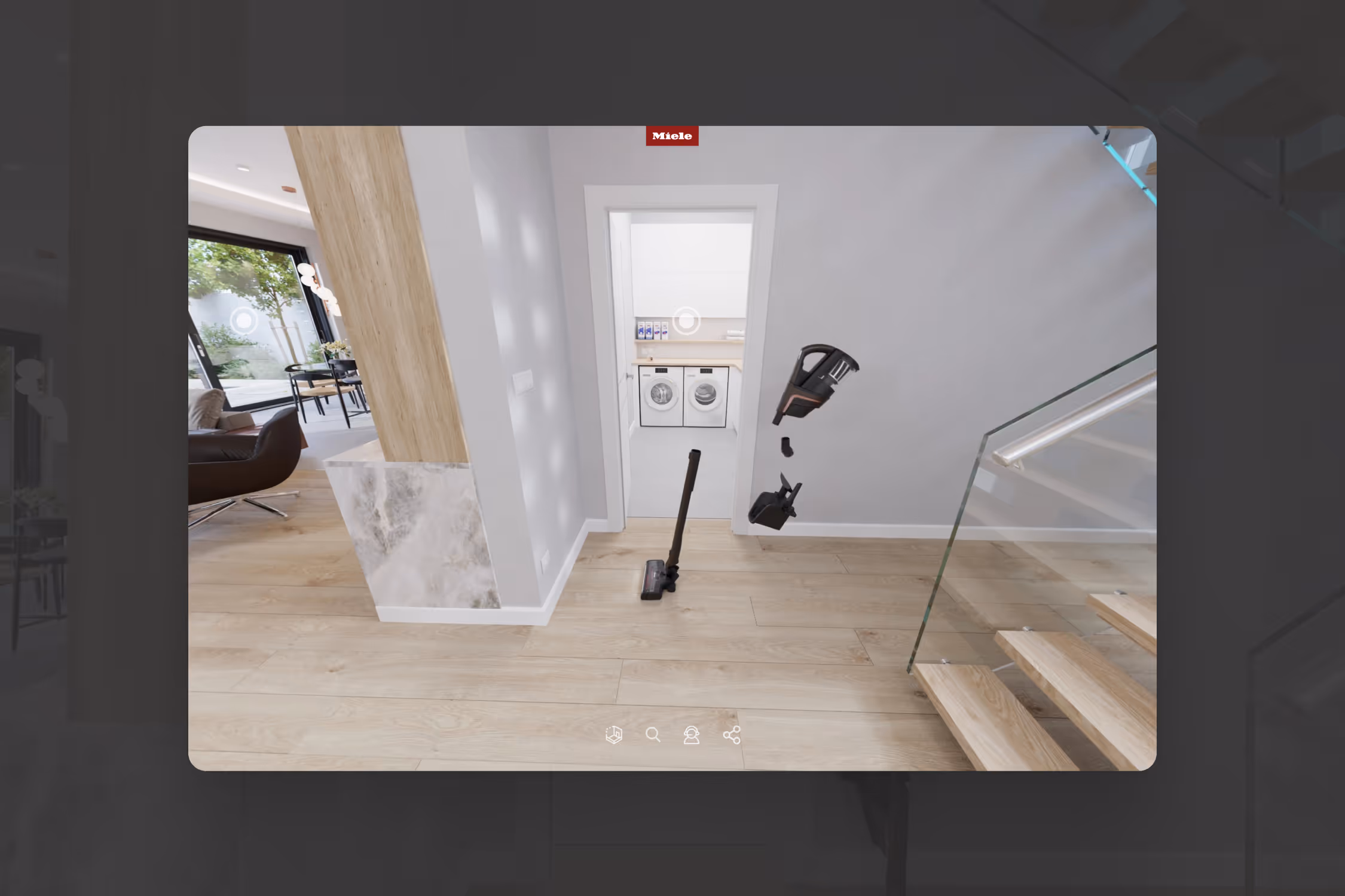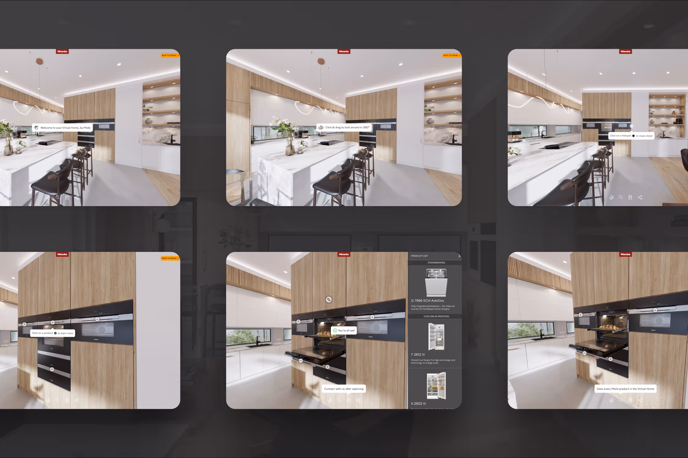 The tour features a custom interface with intuitive navigation, a product search function, a 3D floor plan, and interactive hotspots throughout the home. A guided onboarding flow walks first-time visitors through everything from navigating the space to finding products and contacting Miele, so the experience feels intuitive from the first click.