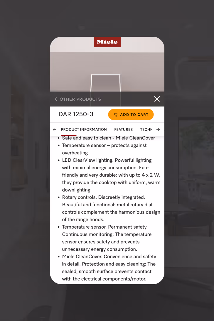The goal was to make exploring 23 different appliances feel effortless. Users can walk through rooms, tap into detailed product information, and interact with the space without ever feeling overwhelmed.