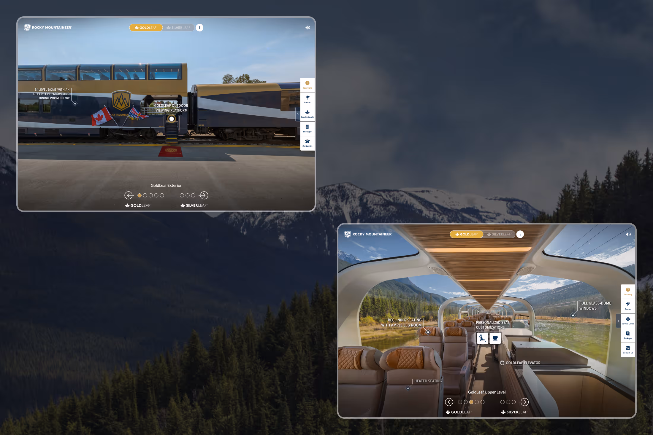 For this project, I designed and developed an interactive virtual tour for the Rocky Mountaineer, assembling panoramic scenes, video content, and interface elements into a cohesive digital experience. The goal was to give potential travelers an engaging preview of the onboard atmosphere while exploring the train’s iconic surroundings and scenic routes.