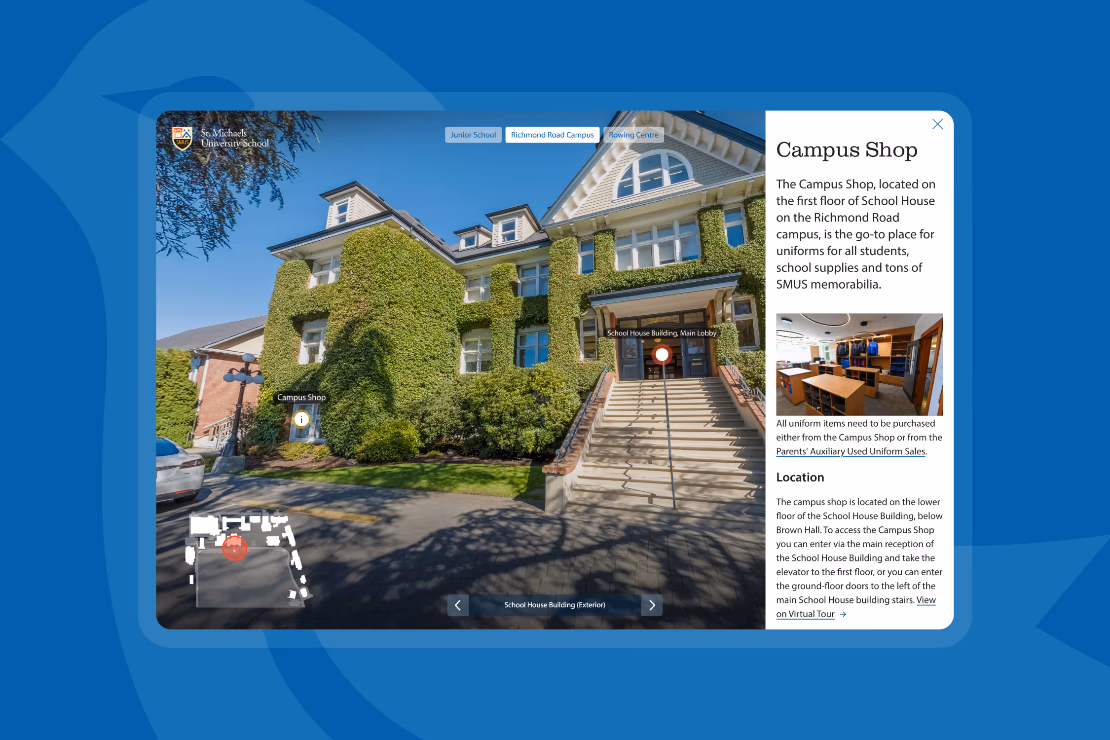 SMUS needed a way for prospective families, alumni, and staff to explore its campuses without being there in person. With multiple locations including the Junior School in Oak Bay, the Richmond Road campus, and the SMUS Rowing Centre, the challenge was capturing the full scope of the school while making it feel personal and alive, not just a collection of 360° images.